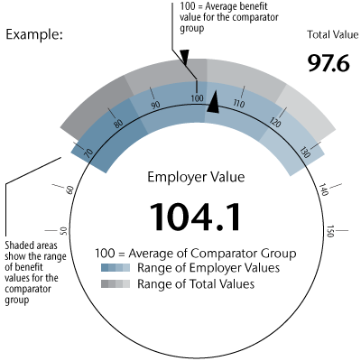 Benefit Index uses actuarial techniques to compare your benefits to programs in your selected peer group, based on relative values calculated from plan specifications—not cost—eliminating a common source of bias. The resulting analysis details all major benefit areas, including: