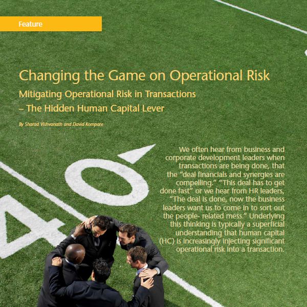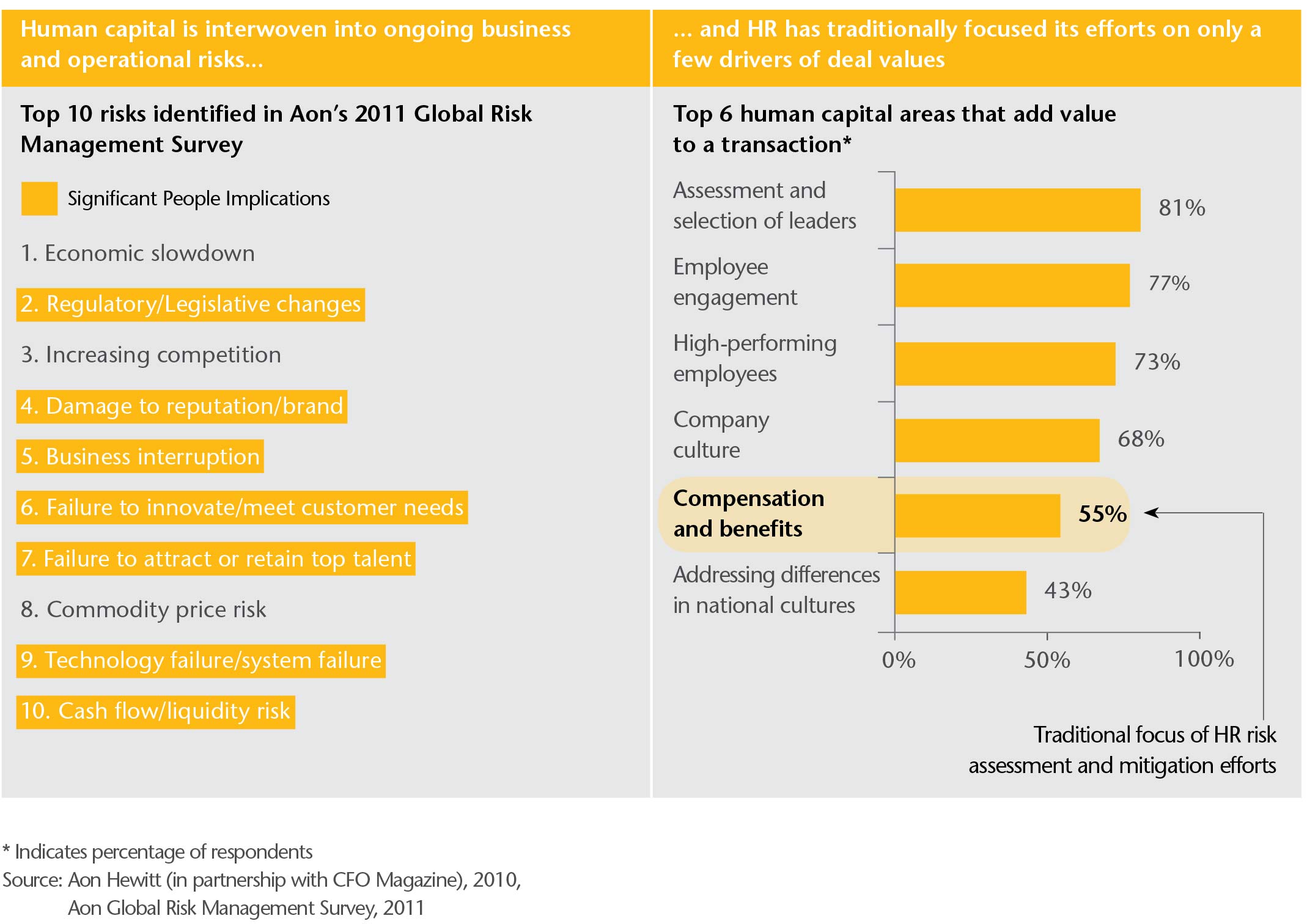 Our research with CFOs and CEOs indicates that five of the top seven operational risks identified (and seven of the top ten) have a direct and significant human capital linkage (see graphic below). Based on our body of work in advising over 3,000 transactions and USD 1.5 Trillion worth of deals, we encounter such examples fairly often. For example, business interruption is a key identified risk that is clearly and directly impacted by human capital aspects such as key talent/key skills flight, employee transfer delays/disruption, employee productivity and engagement drops, misaligned KPIs post transactions, etc.