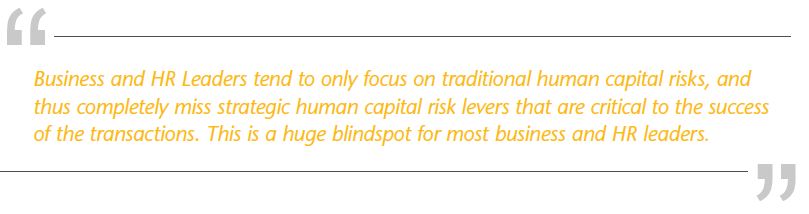 Unfortunately, we continue to see business and HR leaders focusing only on traditional human capital risks like employment terms, employee relations, compensation & benefits, and liabilities. Make no mistake, these risks are important, but these are “table stakes” and “blocking and tackling issues.” Most times, the strategic human capital risk levers that are critical to the success of the transaction are completely missed or not adequately understood and addressed. This is a huge blind spot for most business and HR leaders alike. Only some sophisticated acquirers, in our experience, have made this connection. Interestingly, this is not about operational risk mitigation alone, but also about knowing what elements will drive or derail cost and growth synergies, as pointed out above. Smart clients appreciate that, assess and quantify the risk, and put correction mechanisms into effect during integration planning or pre-Day 1.