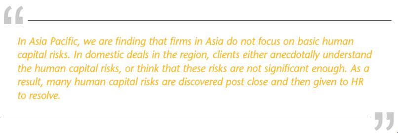 In Asia Pacific, we tend to find this issue is exacerbated both in domestic and outbound deals. We are finding that firms in Asia do not even focus on the basic human capital risks, let alone the higher order strategic human capital levers. In domestic deals in Asia, we routinely find clients thinking that they anecdotally understand the human capital risks or that these risks can be managed or that such risks will probably not be material enough. It may be so, but there are so many instances of human capital risk being discovered post-close and then given to HR to resolve.